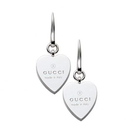 Orecchino pendente con chiusura ad amo in argenteo 925, ciondolo a forma di cuore con inciso logo Gucci.
