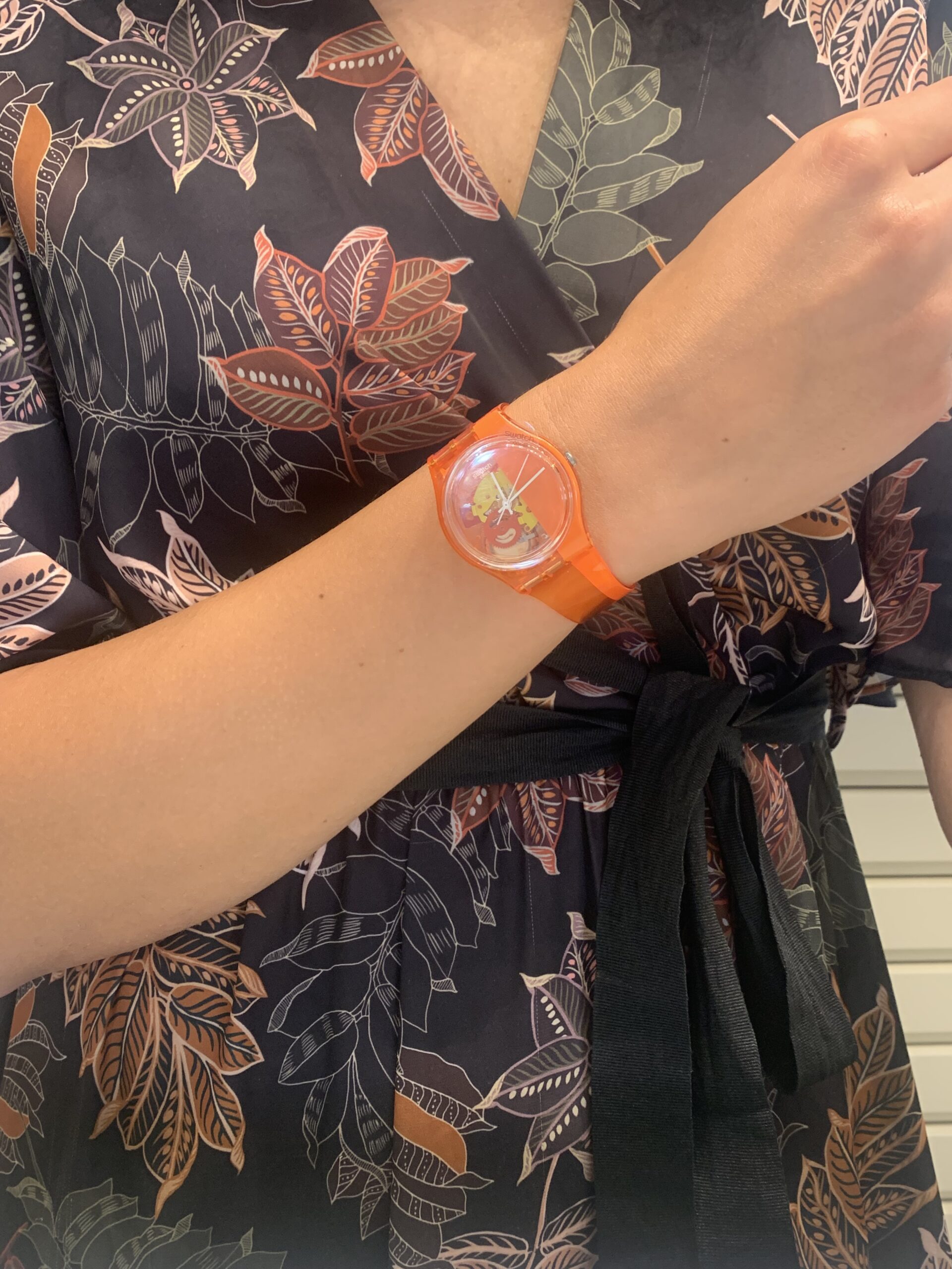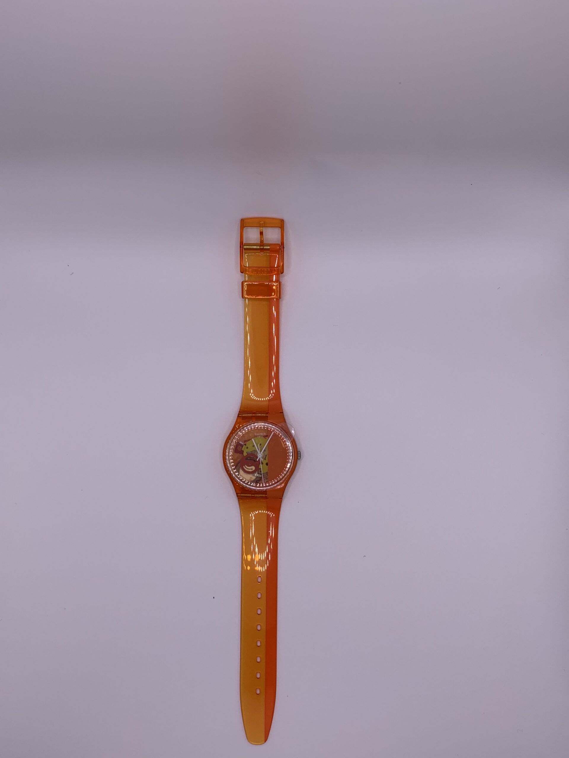 Orologio Swatch in silicone color arancio con quadrante scheletrato e movimento a vista.