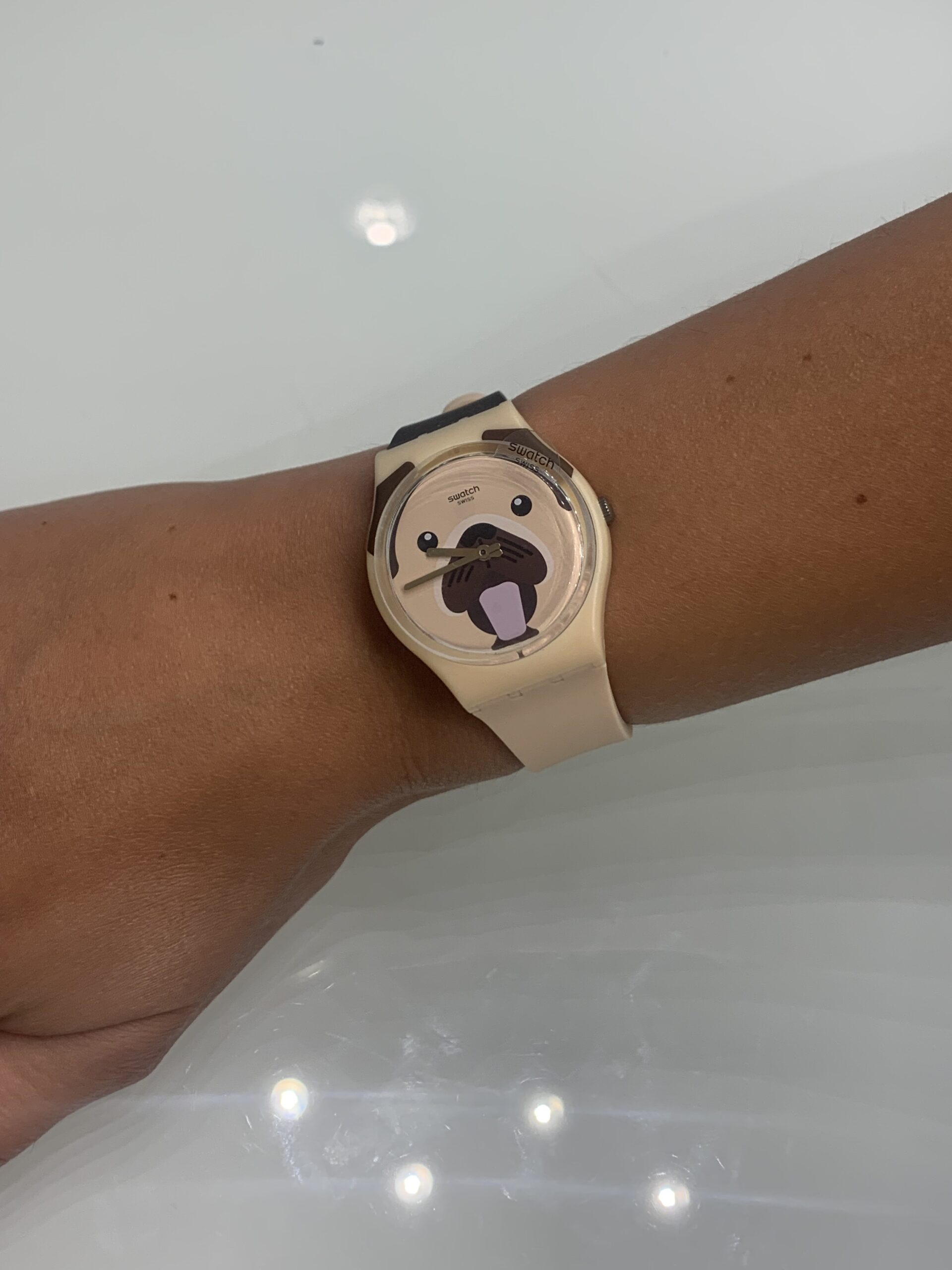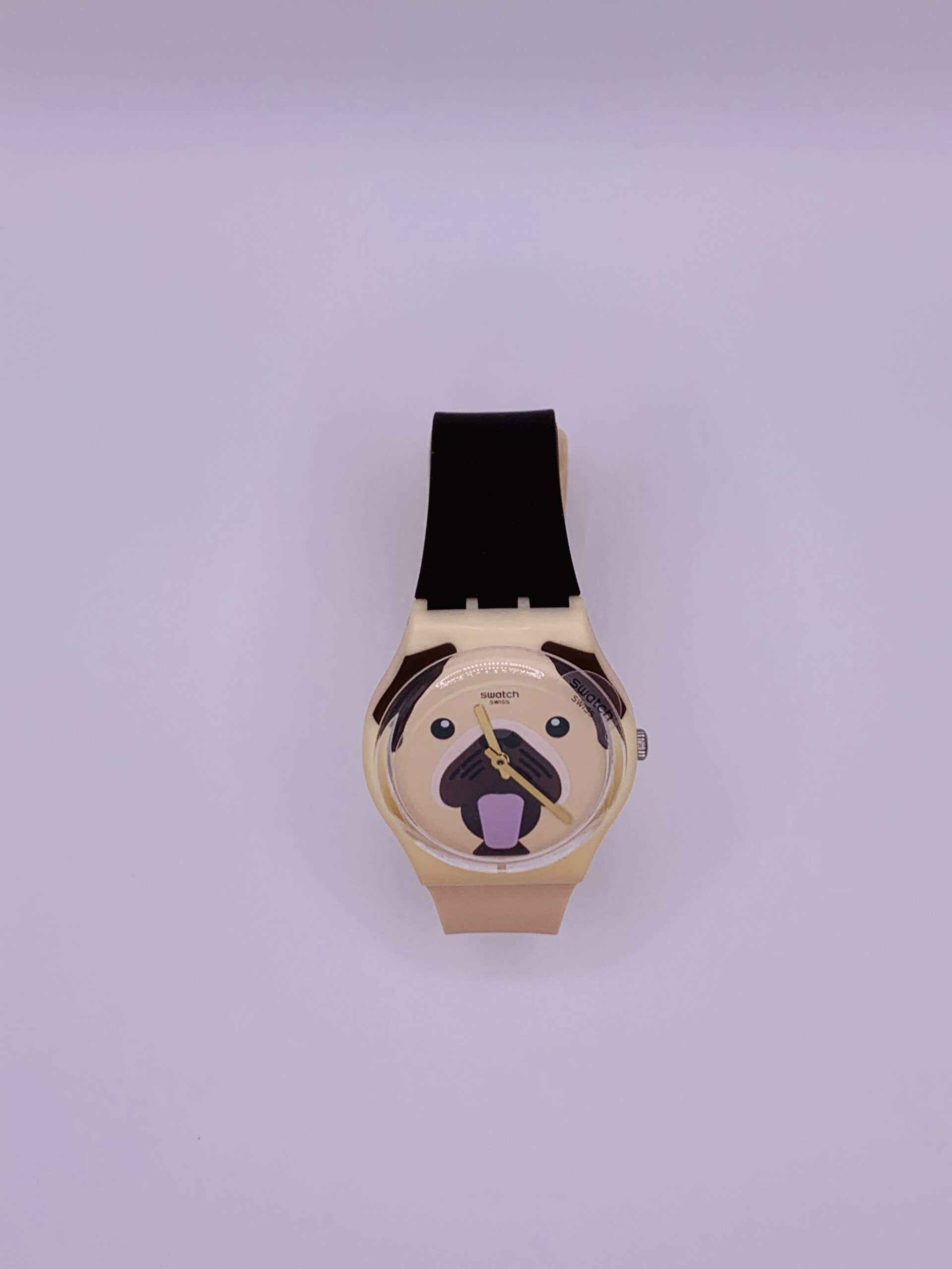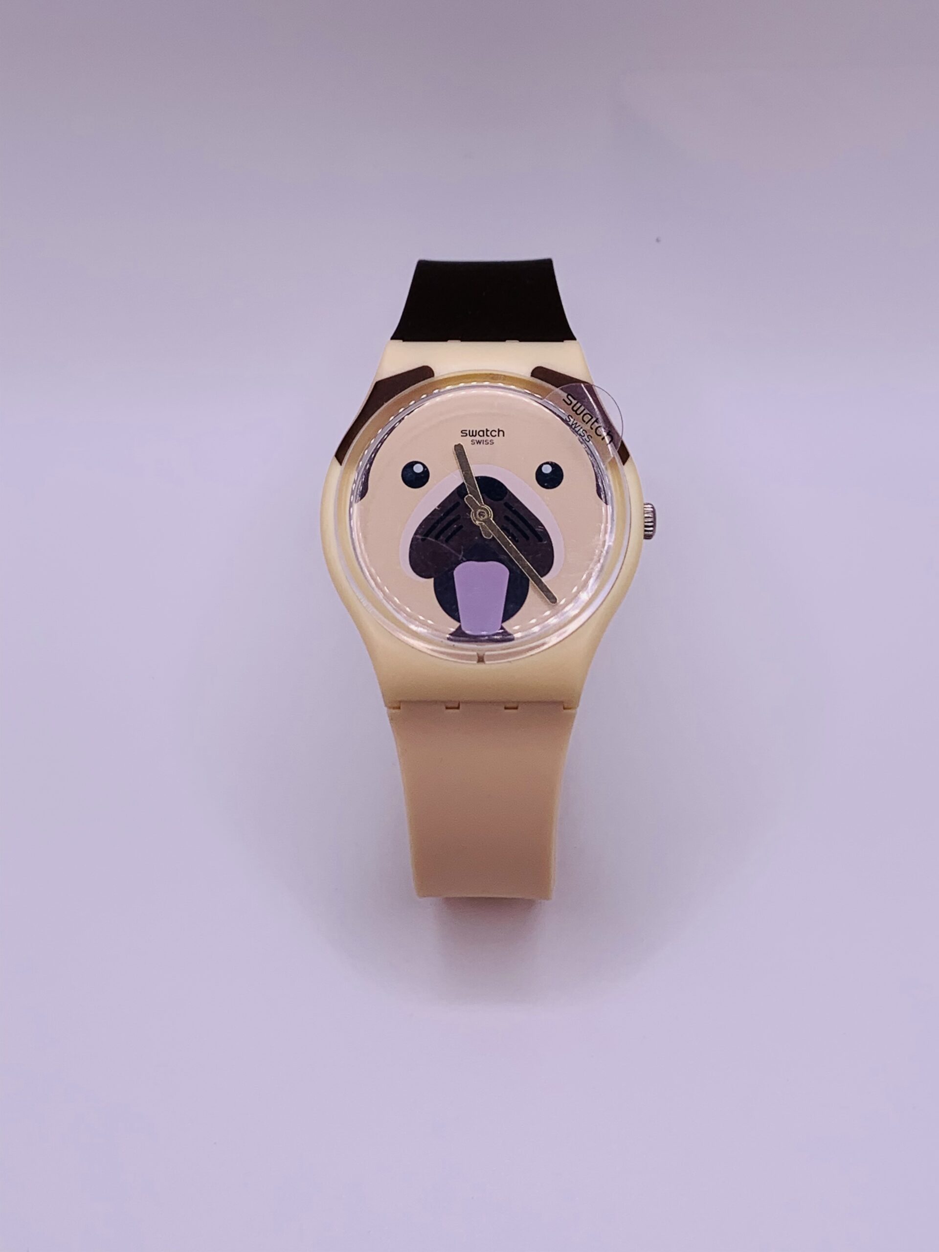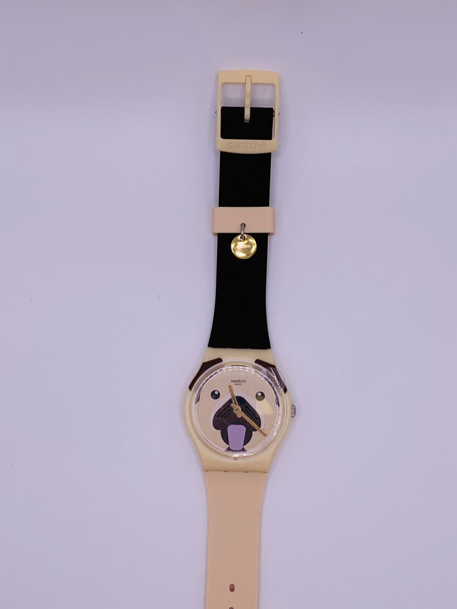 Con un carlino sul quadrante, la metà superiore del cinturino è marrone scuro con passante marrone chiaro e una scintillante medaglietta color oro.